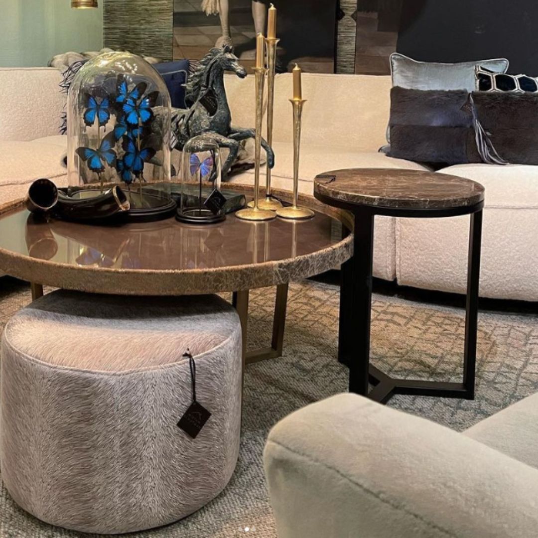 Strakke lijnen worden verzacht met organische vormen zoals ronde tafels en zachte gordijnen.