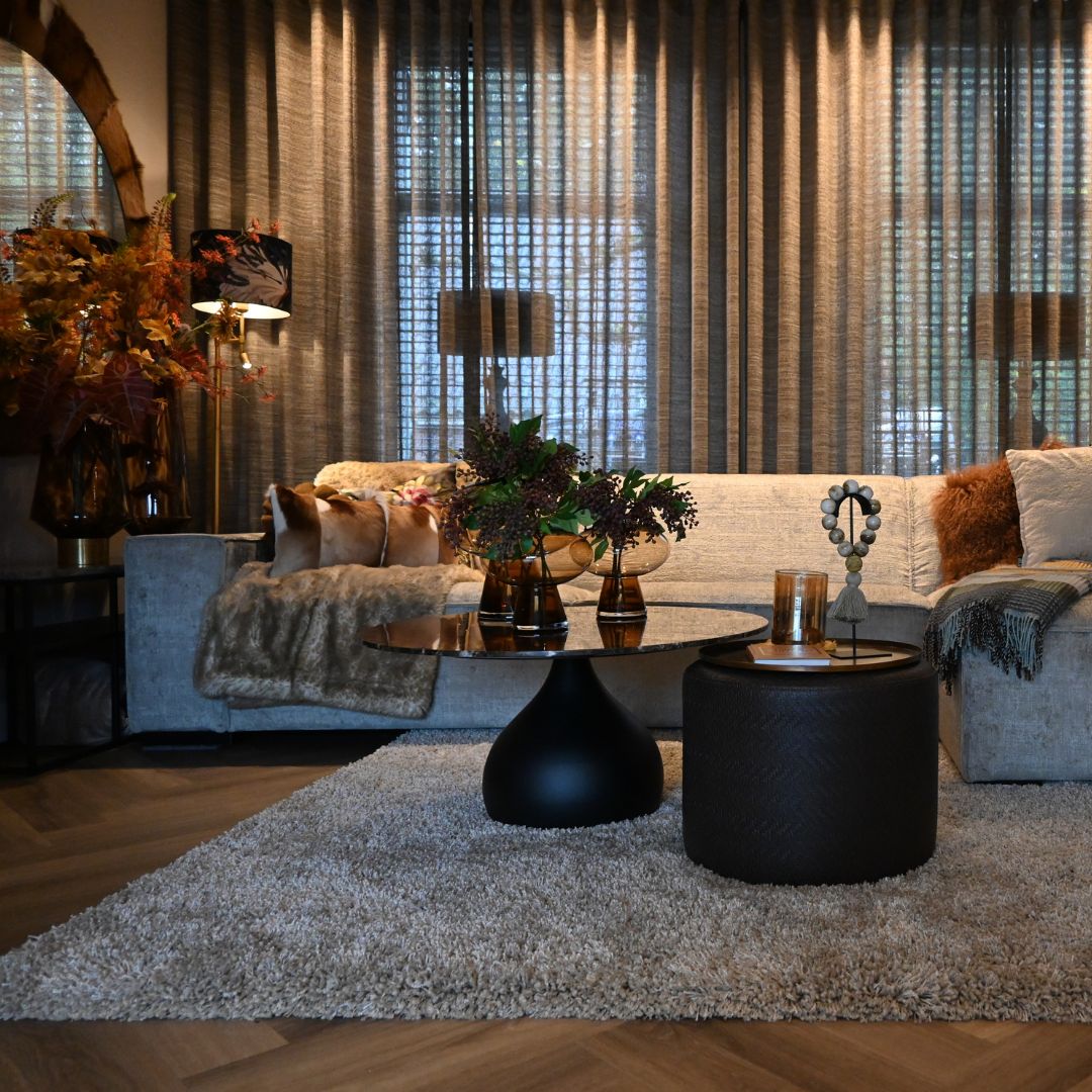 - Zacht versus hard: combineer een robuuste salontafel met een aaibare stof op de bank, ruw leer met een zacht plaid of een plavuizen vloer met een hoogpolig tapijt